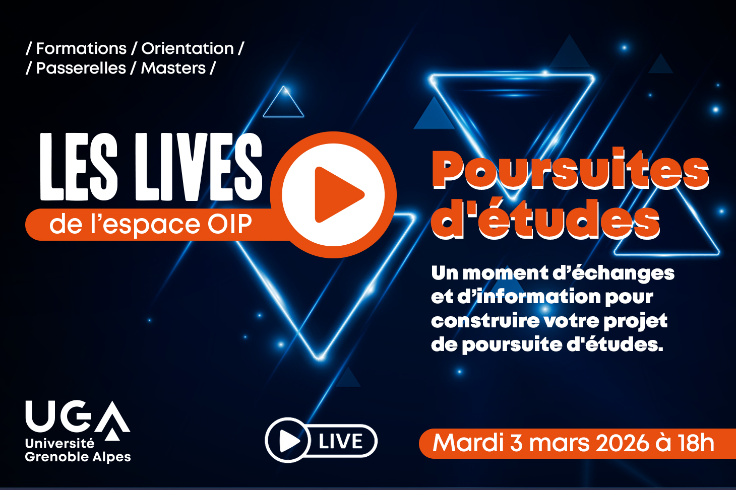 Ce live sera aussi l’occasion de vous présenter le Forum des poursuites d’études qui aura lieu sur le campus et avec quelques conférences à distance le jeudi 5 mars 2026, de 12h à 17h.
